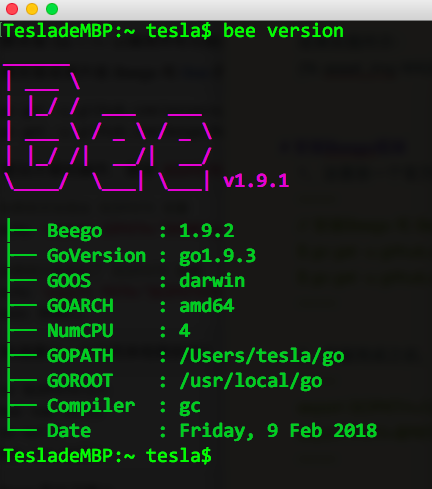 3、这时终端执行bee version可看到版本号等信息。